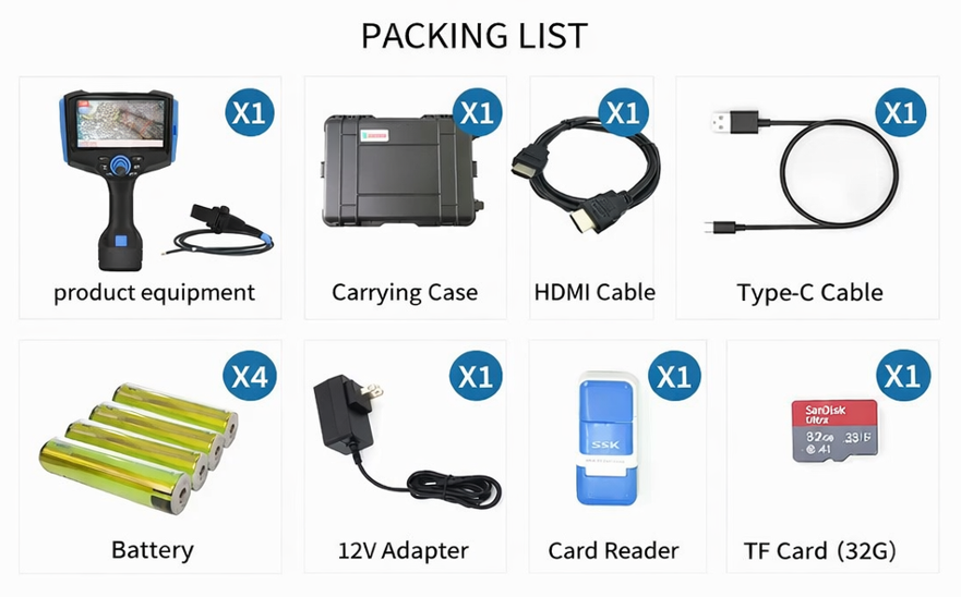 (JPG & AVI)Waterproof Probe & Camera : IP67 Language 16, including Chinese, English, Japanese, German, French, Italian, Arabic Software Function take pictures, video, audio recording Data Transmission Type-C; Wi-Fi & Bluetooth (optional) Data Port 32GB TF card, Max 128GB Storage Temperature -30℃~80℃ Working Temperature -30℃~80℃ Battery capacity 7.4 V, 6400 mAh, replaceable